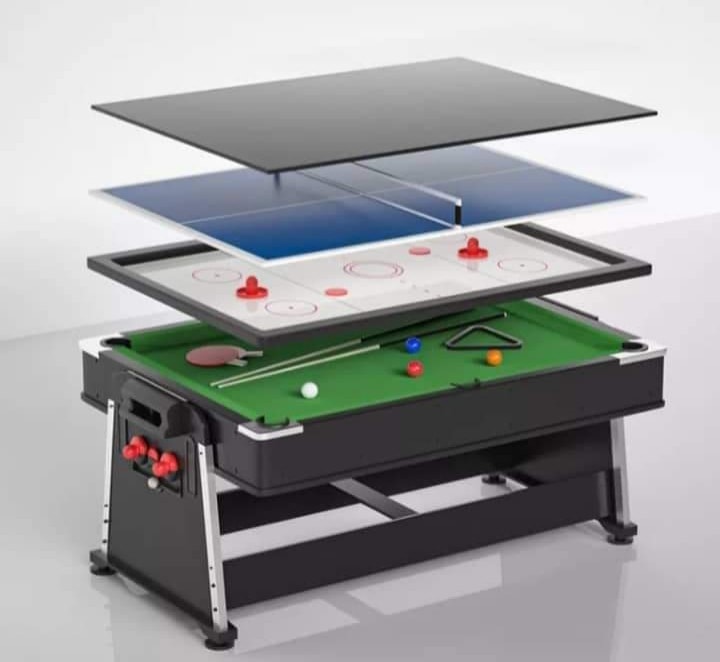 A multi-game table typically includes billiard/pool, table tennis, air hockey, and a dining/utility top.
